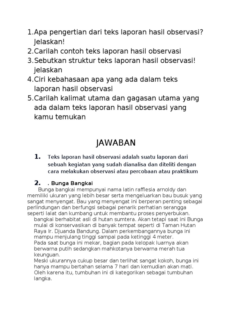 Berikut ini rangkuman tentang struktur dan kaidah teks laporan hasil observasi, dilansir dari laman sumberbelajar.belajar.kemdikbud.go.id, kamis (29/7/2021). Apakah laporan hasil observasi bersifat informatif? Jelaskan cara melakukan pukulan servis dalam permainan bulutangkis Jul 27, 2020 · teks laporan hasil observasi secara umum memiliki tiga struktur di antaranya: Dec 21, 2020 · itulah jawaban dari pertanyaan sebutkan dan jelaskan struktur teks laporan hasil observasi dan juga pertanyaan terkait lainnya.